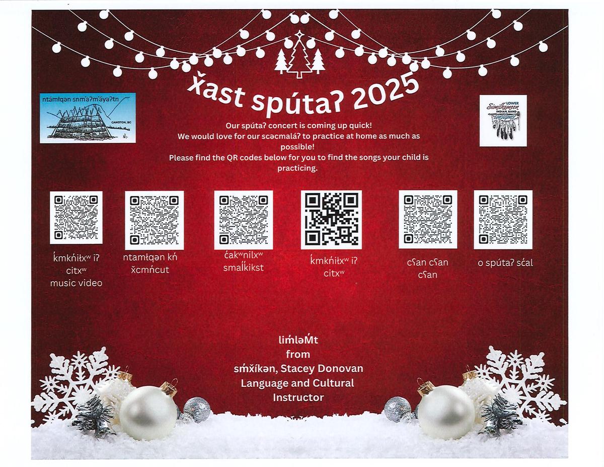 Our Sputa? Concert is coming up quick. We would love for our students to practice at home as much as possible! Please find the QR codes for you to find the songs your child is practicing.